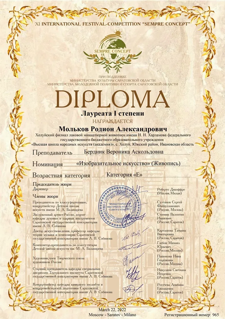 В Марте 2022г. при поддержке Министерства культуры и министерства молодёжной политики и спорта Саратовской области проходил XI Международный фестиваль-конкурс "Sempre Сoncept". По итогам конкурса студенты 2 курса СПО (ЛМЖ) стали победителями в двух возрастных категориях: Мольков Родион Александрович - Лауреат I степени (возраст. кат. E) Костина Ульяна Александровна - Лауреат I степени (возраст. кат. F). Благодарность за подготовку победителей, грамотную и высокопрофессиональную работу получил преподаватель Рисунка и Живописи БЕРДНИК ВЕРОНИКА АСКОЛЬДОВНА.